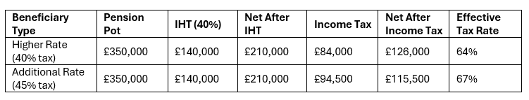 For estates that have already used their nil-rate bands, the pension pot will be taxed at 40% IHT. Additionally, if the deceased was over 75, beneficiaries will also pay income tax on withdrawals at their marginal income tax rate. This combination can result in an effective tax rate of up to 67%. See table below: